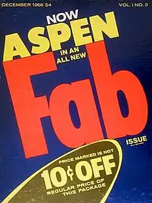 Aspen was a multimedia magazine published on an irregular schedule by Phyllis Johnson from 1965 to 1971.[1][2] The magazine was based in New York City.[3] Described by its publisher as "the first three-dimensional magazine," each issue came in a customized box or folder filled with materials in a variety of formats, including booklets, "flexidisc" phonograph recordings, posters, postcards and reels of super-8 movie film. Many of the leading figures in contemporary North American and British art and cultural criticism were editors, designers or contributors to Aspen. The magazine has remained of interest to students of the artistic ferment of the late 1960s; extensive documentation of Aspen's contents is available online at UbuWeb.[4]