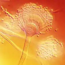 Aspergillus terreus, like other species of Aspergillus, produces spores that disperse efficiently in the air over a range of distances.[14][15] The morphology of this fungus provides an accessible way for spores to disperse globally in air current.[16] Elevation of the sporulating head atop a long stalk above the growing surface may facilitate spore dispersal through the air.[17] Normally, spores in fungi are discharged into still air, but in A. terreus, it resolves this problem with a long stalk and it allows the spores to discharge into air currents like wind.[18] In turn, A. terreus has a better chance to disperse its spores amongst a vast geography which subsequently explains for the worldwide prevalence of the fungus.