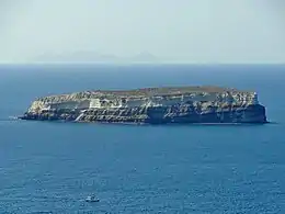 Aspronisi (Greek: Ασπρονήσι) is an uninhabited island lying within the Santorini caldera.[1] The island was originally formed by the massive Minoan eruption in the 2nd millennium BC, after which it was gradually built up by successive volcanic activity.[2] The name Aspronisi, which means 'White Island' in Greek, is derived from the island being partially composed of white pumice.[3][4]