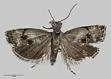♂ ♀. 9 1⁄2 mm. Head fuscous with whitish scales. Palpi with whorls of white black-dotted scales with longer tuft beneath. Thorax bronzy-brown dotted with black and with longer scales. Legs dark fuscous irrorated with whitish. Antennae blackish annulated with grey. Abdomen dark fuscous, margins of segments grey. Forewings elongate, costa anteriorly arched, apex moderately obtuse, termen slightly rounded, oblique; dorsum gently oblique, rounded along inner half; bronzy-brown; a grey inwardly-oblique area at rather less than 1⁄2, distinct on dorsal side but obscurely reaching costa; a black transverse line at 1⁄2, convex outwardly with tendency to form about three dots across wing, outwardly bordered and dotted with metallic silvery markings; a bronzy-brown transverse area at about 3⁄4 crossed by grey, more definite towards dorsum; a row of metallic silvery dots at 4⁄5 transversely to reach tornus; outwardly and at apex of wing blackish: cilia grey with black basal and median lines with suffusion of dark fuscous at apex and anal angle, tips whitish. Hindwings dark fuscous, lighter on basal half: cilia grey with dark-fuscous basal and fuscous median lines, tips whitish.[3]