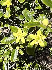 Asterolasia buxifolia is a spindly shrub that typically grows to a height of 1–2 m (3 ft 3 in – 6 ft 7 in) with its stems covered with star-shaped hairs. The leaves are leathery and egg-shaped with the narrower end towards the base, 5–18 mm (0.20–0.71 in) long and 3–10 mm (0.12–0.39 in) wide on a petiole 2–7 mm (0.079–0.276 in) long. The upper surface of the leaves is glabrous but the lower surface is covered with star-shaped hairs. The flowers are arranged singly in leaf axils, each flower on a pedicel up to 1–1.5 mm (0.039–0.059 in) long. The five petals are yellow, elliptical, 6–7 mm (0.24–0.28 in) long and covered with star-shaped hairs on the back.[2][3][4]