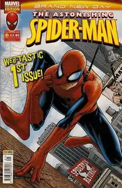 With Panini Comics having obtained the licence to reprint Marvel comics internationally, Astonishing Spider-Man began publication in November 1995.[4] 150 issues were published in the first volume before the title was re-launched in 2007 to mark its change from a four-weekly publishing schedule to a two-weekly one.[5] Volume 2 ran for two years before it was re-launched again in December 2009 to mark the start of the "Brand New Day" storyline. Volume 4 launched in October 2013 as the Superior Spider-Man run of stories began in the title. Volume 7 is ongoing.