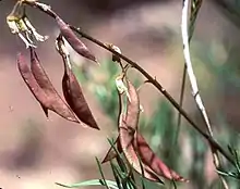 This plant is a perennial herb growing up to one meter tall with stems arising from an underground caudex. This caudex branches into stems underground and has been called a rhizome. The leaves are compound, each made up of up to 19 leaflets. The plant is mostly hairy, with silvery hairs giving it a grayish appearance. The flowers are yellow and between 1 and 2 centimeters long. The fruit is a flat pod up to 3 centimeters long. Each fruit has a long stipe, the area between the stem and the fruit. Flowering occurs in June and July.[1]