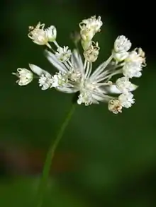 Astrantia carniolica reaches on average less than 45 centimetres (18 in) of height.[3] The stem is erect and glabrous, with little branches and few leaves. The basal leaves have a long petiole 10–20 centimetres (3.9–7.9 in), 3 to 7 lobes and toothed segments. Size: 8–15 centimetres (3.1–5.9 in). The cauline leaves are generally two, sessile, amplexicaul and lanceolate-shaped with a trilobed apex. The inflorescence is umbrella-shaped, with 2–3 centimetres (0.79–1.18 in) of diameter. The floral bracts are numerous (10 - 20), 10–18 millimetres (0.39–0.71 in) long, reddish (sometimes white) with acuminate apex. The small flowers are white. The central ones are hermaphrodite, while the external ones are male. The petals are white, while the stamens are five and much longer. Size of the flowers: about 1–2 mm. The flowering period extends from June through September.