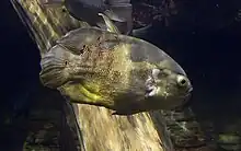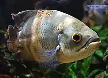 The oscar (Astronotus ocellatus) is a species of fish from the cichlid family known under a variety of common names, including tiger oscar, velvet cichlid, and marble cichlid.[1] In tropical South America, where the species naturally resides, A. ocellatus specimens are often found for sale as a food fish in the local markets.[2][3] The fish has been introduced to other areas, including India, China, Australia, and the United States. It is considered a popular aquarium fish in Europe and the U.S.[4][5][6]