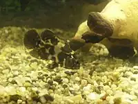 Although the species is widely regarded as sexually monomorphic,[5] males have been suggested to grow more quickly, and in some naturally occurring strains, males are noted to possess dark blotches on the base of their dorsal fins.[6][7] The species reaches sexual maturity around one year of age,[15] and continues to reproduce for 9–10 years.[15] Frequency and timing of spawning may be related to the occurrence of rain.[16] A. ocellatus fish are biparental substrate spawners, though detailed information regarding their reproduction in the wild is scarce.