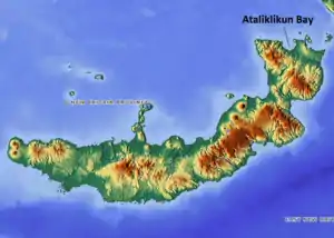 Ataliklikun Bay (pronounced "At-lik-lik-kun") is a bay of East New Britain Province, Papua New Guinea, opening into the Bismarck Sea. It is located in the northern part of New Britain, south-west of Lassul Bay and to the west of Cape Lambert and Rabaul. Urara Island is located in the northern part of the bay. The Raulavat plantation lies in the eastern part of its 25-mile shoreline.[1] The villagers along the shore reportedly speak the Minigir language and the Masava dialect of Tolai.[2] The United States Hydrographic Office said "a reef awash, about 200 yards long east and west, with 15 and 19 fathoms around, on which the steamer Seestem struck in 1909, lies in the south-west part of Ataliklikun Bay."[3]