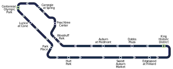 The Downtown Loop runs 2.7 miles (4.3 km) east-west, serving 12 stops,[11] from Centennial Olympic Park to the Martin Luther King, Jr. National Historic Site, with tracks that converge at Woodruff Park.[12] The route provides access to MARTA heavy rail lines at Peachtree Center.[13] The vehicle maintenance facility is located under the I-75/I-85 overpass on Edgewood Avenue[14]