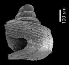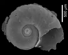 Juveniles of this species are easily recognised by their shape and ornament.[1] The protoconch is rather high conical and has 3½ - 3¾ whorls, slowly increasing in diameter.[1] On the first whorl, in front of the nucleus, an ornament is seen of some nine or ten irregular spirals.[1] Two stronger spirals from the second whorl on delimit a subsutural zone and the base of the shell.[1] On these spirals the whorl profile is slightly angular.[1] The whole surface of the protoconch is furthermore covered with numerous finer spirals in an irregular zigzag shape, also on the base and within the umbilicus.[1] The boundary with the teleoconch is made distinct by the sudden disappearance of these spirals.[1] From that point on the whorl diameter increases rapidly, by which the shape of the shell becomes lenticular.[1] Somewhat more than one teleoconch whorl is present in the largest specimens.[1] The periphery of the body whorl is angular and bears a distinct flange-like keel.[1] The protoconch is visible in an apertural view.[1]