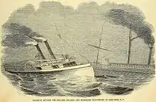 McNeil's actions came too late. Ogdensburg rammed Atlantic on the port side, forward of the paddlewheel, cutting into Atlantic's side down to the waterline.[12] Ogdensburg reversed and backed away from Atlantic, while Atlantic continued away under full steam.[14] Perhaps reassured by Atlantic steaming away, McNeil steered Ogdensburg back onto its regular course.[12] Many passengers on Atlantic were awakened by the collision, but the crew of Atlantic made no effort to alert all the passengers.[15][14] Water flowing in through the hole in Atlantic soon flooded the boilers, bringing the ship to a halt.[15] The passengers and crew began to panic, many throwing anything that would float over the side of the ship before jumping over the side themselves, where many drowned.[15] An attempt was made to launch Atlantic's three boats; one capsized,[16] and Captain Petty suffered a concussion while lowering another, leaving him unable to provide any more assistance.[17] The two other boats were lowered, carrying mostly crew members.[16][15] The bow of Atlantic began to sink, but the stern was kept above water by air trapped inside the ship.[18][17]