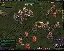 The game's battle system is turn-based.[17] When a player character and an enemy character come into contact with each other on the game map, both parties are transported into an instance where the battle takes place. During battle other players' groups and other monster groups may join in to a maximum of three groups on each side. In battle, the characters of each party are positioned on a 3x3 grid. Using attacks and abilities, the goal is to beat the opponent. The rewards include experience points and loot like the game's virtual currency, various materials, pieces of equipment etc. Player versus player combat operates through this system. There are two leagues players can join, as well as daily, weekly, and monthly fights and championships.