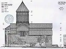 Prior to that, the building had been reduced to ruins: the dome and all vaults had collapsed, as had upper walls. Portions of the altar and the chambers on either side thereof—the diaconicon on the south and the prothesis on the north—with protruding faceted walls had survived. The interior walls preserved fragments of the décor such as pilasters with architraves and ornamented details of the altar wall. Richly ornamented stones from the church can be found scattered elsewhere in the village, used by locals for their own structures.[5] Archaeological digs have found several other buildings, such as a 10th-century church and accessory structures, with medieval Georgian inscriptions, in and around the ruined cathedral.[2][8]