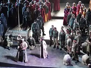 As things turned out, Verdi returned to Piave for the completion of act 3 – with Solera's blessing.[8] However, the relationship between composer and the new librettist worsened in a variety of ways, especially over the use of stage bands in the context of the composer claiming to think in terms of his work being a grand opera: "Aren't Guillaume Tell and Robert le Diable grand operas? Yet they don't contain a band."[9] And the differences between Piave's version and what Solera (who received a copy of Piave's act 3) had originally conceived were so great as to cause a final rift between Verdi and his long-time collaborator; the composer's ideas of musical theatre had moved far ahead of his older colleague.