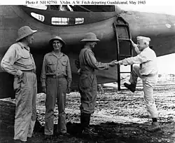 On September 20, 1942, six weeks after the first American amphibious operation of the war got underway at Guadalcanal, Fitch assumed command of Aircraft, South Pacific Force. Not a desk-bound admiral, he carried out numerous, hazardous flights into the combat zones, inspecting air activities incident to the selection of bases for projected operations. For these, he received a Distinguished Flying Cross.