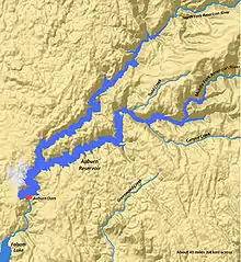 Filling the Auburn Reservoir would result in a two-pronged, 40-mile (64 km) lake which would inundate numerous canyons and rapids of the North and Middle Forks of the American River. In 1981, the American River was acknowledged as the most popular recreational river in California.[19] Over one million people visit the canyons of the North and Middle Forks of the American River each year to engage in various recreational activities, including kayaking, rafting, hiking, hunting, biking, horseback riding, gold mining, off-roading, and rock climbing. About 900,000 of these visitors go to the Auburn State Recreation Area, which includes the former dam site.[30] The reservoir would inundate most of the Auburn recreation area, although some new recreational opportunities such as boating, water-skiing and deep water fishing would be created as a result of the new lake. Many trails, including those used by the Tevis Cup and Western States Endurance Run, would be submerged.[31] The Auburn Reservoir would also result in the destruction of thousands of acres of riverine habitat,[31] and the inundation of historic and archaeological sites.[32]