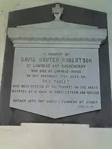 It has a small church whose architect was Frederick Thomas Pilkington (1832–98), the ground given by George Robertson Chaplin (proprietor) of Colliston House, Arbroath, the uncle of David Souter Robertson of Lawhead House nearby, and Murlingden House. The church has two stained glass rose windows, one of which has a spelling error in "Haleluya," though correctly spelled in the original transliteration of the Hebrew הללויה. White marble memorial stones to GRC and DSR, erected by their tenants, are on the back wall.