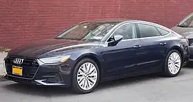 The Audi A7 is an executive luxury five-door liftback coupé produced by Audi since 2010. Also available as a three-box, four-door saloon in China since 2021, it features a sloping roofline with a steeply raked rear window and integrated boot lid (forming the so-called "Sportback"), and four frameless doors.