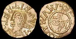 Given the lack of other identification for the diademed figure on the obverse of the coins, Duchalais leaned towards interpreting the coin as the issue of a petty king in Frisia in what is now the central Netherlands[9] celebrating some obscure victory over his enemies or paganism. The Frisians of the era were ruled by numerous petty lords rather than Merovingian agents,[10] and this view is generally upheld by modern Dutch scholars.[11][12][5] Excavations in Westergo in northern Friesland have shown some level of united power or cooperation in the area during the relevant time period, and some scholars even think the victory mentioned on the coins may have been over the Franks themselves, who are recorded contesting control over the Rhine delta with the Frisians in the later 7th century.