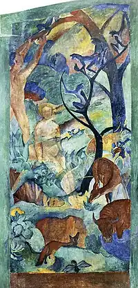 On October 5, 1909, August Macke married his long-time girlfriend, Elisabeth Gerhardt. The couple first lived on Tegernsee, then moved to Bonn. Macke painted continuously, was increasingly finding his direction and urgently needed a studio. This was set up in the attic of the house of his mother-in-law, Sophie Gerhardt, built in 1877–1878, at Bornheimer Strasse 88 (now 96); the renovation was carried out according to plans by the Bonn architect Hermann Schmitt. The father-in-law, the entrepreneur Carl Heinrich Gerhardt, had bought the house in 1884 as his company's archive and furnished it for the purpose. He died in 1907. In February 1911 Macke moved into this house with his wife and son Walter. The studio was Macke's first and only. The few years when was able to work there turned out to be his most productive. The artist completed more than 400 paintings while living in the house. He also often painted his surroundings, the view from the house, the streets and the garden. At the time, Macke had made relatively long journeys to know better modern painting, innovative artists and new surroundings. In the place where he now lived, he welcomed people like Franz Marc, Max Ernst, Guillaume Apollinaire, Robert Delaunay, Gabriele Münter and Paul Klee. With Franz Marc, Macke painted the large mural Paradise on the studio wall in 1912. It was dismantled in 1980 and is now in the Westphalian State Museum of Art and Cultural History in Münster. It was replaced by a copy in the original size, now on display in the Macke Museum.