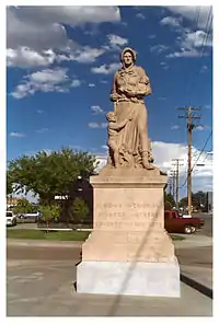 August Leimbach provided much decorative architectural sculpture for the Panama–Pacific International Exposition, San Francisco, but is best remembered for his work with Arlene B. Nichols Moss and the Daughters of the American Revolution in the creation of the Madonna of the Trail monument in 1927. The material, a cast composite stone called "Aldonite" was selected before the sculptor was chosen and the design approved.[1] Twelve monuments were cast and placed in twelve designated cities across the United States, marking the National Old Trails Highway from Bethesda, Maryland to Upland, California. The sculpture itself are representative of the strength, courage, and role of the pioneer woman in establishing the early western territories. Each monument were dedicated in their respective state in 1928 and 1929.