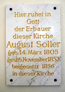 Johann August Karl Soller (14 March 1805 – 6 November 1853) was a Prussian, and later, German architect.[1] He was one of the most important of Karl Friedrich Schinkel's pupils and is regarded as a representative of the Schinkel school.[2] Soller became an influential proponent of Rundbogenstil, a Romanesque revival architectural style that became popular in German-speaking lands and among German diaspora during the 19th century.[3]