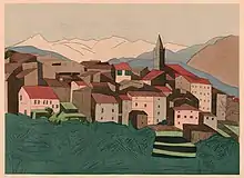 By the early 1930s Rathbone had developed a series of works based on the San Francisco Bay area, and another focusing on the Lake Tahoe-Sierra Nevada areas.[15] In the mid 1930s Rathbone created a series of etchings and colored aquatints based on her travels in the towns and villages of Brittany and the French Riviera. She collaborated with Juliet and Virginia Thompson, resulting in the book French Riviera Villages (1938). Juliet Thompson provided photographs, while Virginia Thompson wrote the text. Mitchell Kennerley published the book, producing twelve of Rathbone’s color aquatints in pochoir.[4]