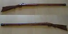 The rifle was originally a fullstock, but was either damaged and repaired or intentionally cut down to a halfstock length. A custom pewter nose cap on the stock and an oak underrib were added in the modification. The front sight is a copper base with bone blade. The cheekpiece is an earlier square style typically found on flintlocks, rather than the beavertail typical of later percussion locks.[12]