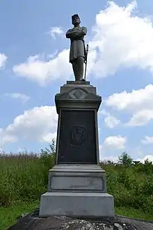 After the war, the citizens of Orange County raised money to erect a monument to the 124th Regiment at Gettysburg. Dedicated on July 2, 1884, it was the first regimental New York monument placed on the field. Located on Houck's Ridge where the regiment stood above the triangular field, the monument has a life-sized statue of Colonel Ellis, standing with his arms folded gazing calmly ahead.[11] It is the only official full-sized statue of a Union regimental commander at Gettysburg.[12]