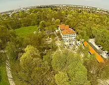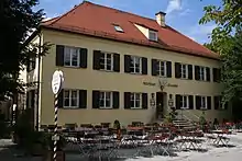 After the foundation of the Englischer Garten, the Aujägermeister house was relocated from Altstadt-Lehel to the northern edge of Freimanner Flur and became part of the new neighbourhood of Kulturheim in 1803 together with three newly built gardens.[2] From 1810 to 1811 the new master builder Joseph Deiglmayr erected a new inn building at the site of the old garden inn in the form of a two-storey hip roofed building in the neoclassicist style, which came to be called "Aumeister" in modern times. The building is protected. As the hunt master not only had to take care of the game in this part of the Isar meadow area, but also entertain the hunting guests, Aumeister became popular as a refreshment place even before the hunt. In 1845 it was described as a "comfortable place frequented by the upper class".[3] Aumeister became a beloved inn with a nearby beer garden, which is frequented by visitors to this day. Aumeister became a part of Freimann in 1808 and was annexed to Munich in 1931 in connection with it.[4]