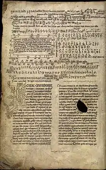 Auraicept na n-Éces (Old Irish: [ˈaurikʲept na ˈnʲeːgʲes]; "the scholars' [éices] primer [airaiccecht]"; Scottish Gaelic: Uraiceachd nan Èigeas, Irish: Uraiceacht na nÉigeas) is an Old Irish text on language and grammar. It was historically thought to be a 7th-century work of Irish grammarians,[1] written by a scholar named Longarad.[2] The core of the text may date to the mid-7th century,[3] but much material was added between that date and the production of the earliest surviving copy in the 12th century. If it indeed dates to the 7th century, the text is the first instance of a defence of vernaculars, defending the spoken Irish language over Latin, predating Dante's De vulgari eloquentia by 600 years and Chernorizets Hrabar's O pismeneh by 200 years.