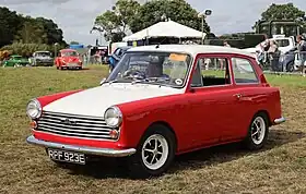 The Countryman hatchback appeared exactly a year later in October 1959,[8] and differed from the saloon in that the rear window was marginally smaller, to allow for a frame that could be lifted up, with its own support, while the lower panel was now flush with the floor and its hinges had been strengthened.[9] It was a very small estate car with a horizontally split tailgate having a top-hinged upper door and bottom-hinged lower door. October 1959 also saw the standardisation on both cars of self-cancelling indicators and the provision of a centre interior light and, in early summer 1960, a flat lid was added over the spare wheel in the rear luggage compartment.[8]