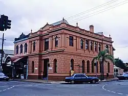 The former Australian Joint Stock Bank is a prominent building in Maryborough, located on the corner of Richmond and Kent streets in the central business district of the town. The building comprises a two-storeyed section to Kent Street with a one storeyed wing to the rear, accessed from Richmond Street.[1]