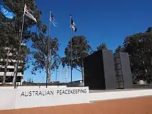 The Australian Peacekeeping Memorial, located at the southern end of Anzac Parade in Canberra, Australian Capital Territory, commemorates the service and sacrifice of all Australians who have served on peacekeeping or peacemaking missions around the world. It was inaugurated on 14 September 2017 by the Governor-General of Australia, General Sir Peter Cosgrove AK MC. The Memorial is a living memorial that commemorates the service of all Australian peacekeepers- past, present and into the future.