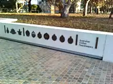 To the right on the plinth are logos representing the armed and civil (police) services who have been part of the peacekeeping forces deployed by Australia. To the left are plaques in English and Braille outline the purpose, symbolism, major donors, memorial contractors and the dedication of the memorial.