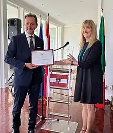 On October 28, 2010, the Austrian ambassador to Australia, Dr. Hannes Porias, conferred the award to the Austrian-born Holocaust survivor Eva Marks in Melbourne and read a letter of congratulations from the president of the Austrian parliament, Barbara Prammer. Also the prime minister of Australia, Julia Gillard, sent a congratulatory letter, conferred by the Australian MP Michael Danby.[5]