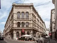 In 1860, the Bank moved across the street to a new building complex designed in 1855 by architect Heinrich Ferstel, himself the son of a Nationalbank official,[10]: 18 with ornate decoration including twelve statues by Hans Gasser representing the lands of the Austrian Empire.[11] The lavish interior decoration included works by painters Franz Josef Dobiaschofsky and Carl Joseph Geiger, and sculpture by Joseph Gasser von Valhorn and Franz Melnitzky.[10]: 18 The complex also hosted the Wiener Börse (which only stayed there until 1869), a commercial mall (German: Basarhof), and from its opening in 1876, the famed Café Central.[4] In 1897, the Bank expanded into the adjacent Palais Hardegg on Freyung 1, where the Bank relocated its Austrian general management and the Governor's office.[12] In 1924, in advance of its planned relocation, the Bank sold the entire complex to the Anglo-Austrian Bank, which redeveloped it for commercial use. The complex was comprehensively renovated in 1975–1982 and has been known since then as Palais Ferstel, including the recreation of the Café Central within the complex, albeit on a different location from the original.[11]