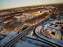 These new planned suburbs, located at the periphery of the metropolitan area, were advertised as a means of escaping the congestion and pollution associated with inner-city living in the early to mid-20th century.[10] The development of replicable integral neighbourhoods, and processes of urban renewal (characterised by the development of street infrastructure) facilitated a suburban exodus from cities during this period, resulting in the dispersion of the western metropolis.[8][12] In a short space of time, a considerable burden was placed on the transit networks of many major North American cities, as processes of urbanisation created entire communities, isolated from what were popularly viewed as obsolete modes of mass transit, of automobile dependent commuters.