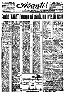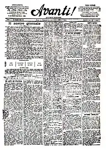 On 23 April 1919, the newspaper, printed in Turin, launched a "solidarity plebiscite" urging its readers and militants to subscribe to support the rebuilding of the Milan headquarters.[23] On 3 May 1920, Avanti! reappeared in the city.[24]
