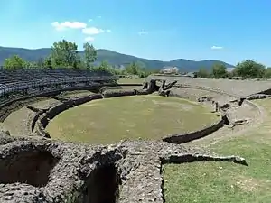 It was located on the south-eastern corner of the walls and partly on a natural slope, only the southern part rests on large vaults, while the arena is below ground level. The two main vomitoria on the major axis of the ellipse (itinera magna) with side rooms, the podium that divided the curve from the arena, and the tuff seats are all well preserved. A schematic image of the building is found on the side of an honorary base from the imperial age. In the late empire, the construction of stables on the podium began, which was then interrupted by the events of dissolution of the Western Roman Empire.