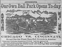 Avenue Grounds was a baseball field located in Cincinnati, USA. Also known as Brighton Park and Cincinnati Baseball Park,[1] the ground was home to the Cincinnati Reds baseball club from April 25, 1876, to August 27, 1879.[2] The ballpark featured a grandstand that could seat up to 3,000 fans. It was approximately 2 miles (3.2 km) north of the Union Grounds, where the original professional team from the area, the Cincinnati Red Stockings, played, and was approximately 4 miles (6.4 km) from the heart of the city,[3] so horse-drawn streetcars and trains were a popular way to travel to the park.[4] The ballpark had first opened in 1875,[1] and would continue to be used for various types of amateur sports until at least the mid-1890s. The major league club of 1876–1879 played poorly, and actually dropped out of the league after the 1879 season ended. The club revived for 1880, and relocated to the Bank Street Grounds.