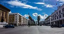 Avenue Mohammed V, sometimes referred to by its old name Avenue Dar al-Makhzen (lit.'Royal Palace Avenue'), is a major thoroughfare in downtown Rabat, Morocco. Its main section was created under the French Protectorate in Morocco and mostly developed between 1915 and 1932, when it was also known as Cours Lyautey.[1] At the southern end of that section is the As-Sunna Mosque, whose history dates back to the 18th century like that of the nearby royal palace or Dar el-Makhzen.