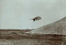 Otto Lilienthal was the first person to make well-documented, repeated, successful flights with gliders,[12] therefore making the idea of "heavier than air" a reality. Newspapers and magazines published photographs of Lilienthal gliding, favorably influencing public and scientific opinion about the possibility of flying machines becoming practical. Lilienthal's work led to him developing the concept of the modern wing.[13][14] His flight attempts in Berlin in 1891 are seen as the beginning of human flight[15] and the "Lilienthal Normalsegelapparat" is considered to be the first airplane in series production, making the Maschinenfabrik Otto Lilienthal in Berlin the first air plane production company in the world.[16] Lilienthal is often referred to as either the "father of aviation"[17][18][19] or "father of flight".[20]