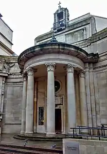 The Church of the Holy Trinity was built of Portland stone between 1909 and 1911 in an Edwardian Baroque[1] style to a design by John Belcher and John James Joass.[2] The facade was modelled on S. Maria della Pace in Rome by Pietro da Cortona.[3] The interior was not completely finished due to a lack of money[4] and a proposed tower was never built.