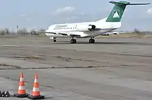 The first jet aircraft, a Tu-134, began service in Moldova in 1971 and became the main aircraft of the enterprise, increasing in number until at one point 26 of them were in use. In Chişinău there was even a USSR test basis for aircraft of this type. The fleet was further enlarged in 1972 with the Yak-42 regional aircraft and in 1974 with the An-26 cargo aircraft. In the middle of the 1980s, Moldovan operations received ten Tu-154 aircraft. At the same time started the construction of a new runway for a new location of Bălți International Airport. At that time Moldovan aircraft flew to 73 cities in the USSR and carried over 1,000,000 passengers per year from Chisinau whereas 20 Soviet cities were connected with direct flights from Bălţi. In 1990 the first international route between Chişinău and Frankfurt am Main was opened. In the beginning of 90's international routes from Bălţi included Istanbul, Moscow, Sochi and Frankfurt, but since 1994 most regular fights from Bălţi were ceased due to the informal directive not to operate international airports around 150 km of Chisinau. Passenger and cargo charter fights continued to be operated from Bălţi until 2015, when the operational certificate for Bălţi International Airport was withdrawn by Civil Aviation Administration.