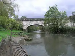 The aqueduct has three arches and is 110 yards (100.6 m) long, with a central elliptical arch of 60 ft (18.3 m) span, and two semicircular side arches each 34 ft (10.4 m) across, all with V-jointed arch stones. The spandrel and wing walls are built in alternate courses of ashlar masonry and rock-faced blocks.[3] The central span sagged soon after it was built and has been repaired many times.[4]