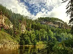 The Ay (Bashkir: Әй, Äy; Russian: Ай) is a river in Bashkortostan and Chelyabinsk Oblast in Russia, a left tributary of the Ufa. The river is 549 kilometres (341 mi) long, and its drainage basin covers 15,000 square kilometres (5,800 sq mi).[1] The Ay freezes up in late October or early November and remains icebound until mid-April. The cities of Zlatoust and Kusa are along the river Ay. Along the banks of the river, there are many steep cliff sides and caves.[2] The current of the river has been used for hydroelectric power. It is also possible to fish for pike, bleak, and carp, to name a few species.[3]
