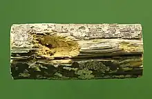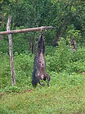 It is the world's largest nocturnal primate.[4] It is characterized by its unusual method of finding food: it taps on trees to find grubs, then gnaws holes in the wood using its forward-slanting incisors to create a small hole into which it inserts its narrow middle finger to pull the grubs out. This foraging method is called percussive foraging, and takes up 5–41% of foraging time.[5][6] The only other living mammal species known to find food in this way are the striped possum and trioks (genus Dactylopsila) of northern Australia and New Guinea, which are marsupials.[7] From an ecological point of view, the aye-aye fills the niche of a woodpecker, as it is capable of penetrating wood to extract the invertebrates within.[8][9]