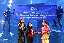 Ayu Saraswati (left) as the Ministry of Women Empowerment and Child Protection of The Republic of Indonesia Ambassador together with Minister Of Women I Gusti Ayu Bintang Darmawati (center), during The Youth Seminar and Press Conference at Jakarta Aquarium and Safari on 2 May 2021.[14][15]