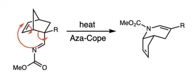 Horowitz and Geissman's first example demonstrates a possible thermodynamic sink to couple with the cationic 2-aza-Cope rearrangement, where the product is biased by the phenyl substituent through aryl conjugation, then captured by hydrolysis of the iminium. Other methods of biasing a product include using substituents which are more stable on substituted carbons, releasing ring strain (for instance, by pairing the rearrangement with cyclopropane opening), intramolecular trapping (pictured), and pairing the rearrangement with the Mannich cyclization.[1][15]