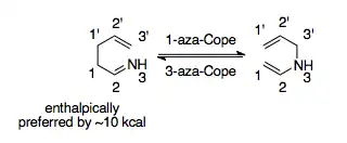 The first discovered 1-aza-Cope reaction was a simple analog to the generic Cope reaction and required intense heat to overcome its large thermodynamic activation barrier; most subsequent work on the 1-aza-Cope rearrangement has thus focused on pairing the arrangement with a driving thermodynamic force to avoid these harsh reaction conditions. It has been hypothesized that the 1-aza-Cope rearrangement rate-determining transition state has partial diradical and dipolar transition state character due to the presence of the heteroatom.[4]